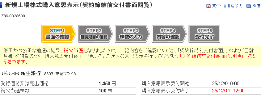 これは当選していれば証券口座に反映されているはずのものが表記されていなかったので気がつきました。