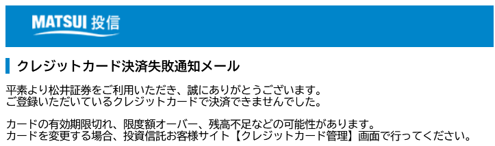 先日、クレジットカードの再発行をした関係でカード番号が変更になったのですが、松井証券のクレジットカードの登録変更を失念しておりました。