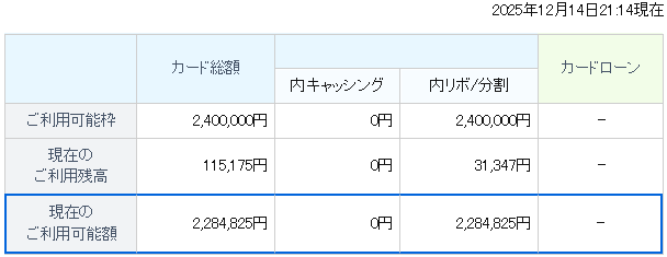 ショッピング枠はどうなるのだろう?と思っていたのですが、2,400,000円となりました。なんか思ったよりも増えたなと思ったのですが、どうやら自分が保有していた2枚のカードが合算されたようです。