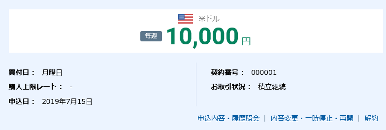 先月までは「月1回50,000円分」と「週1回5,000円分」をそれぞれ別設定してドルの購入をしていました。合わせて月70,000円分程度のドルを買っていた事になります。